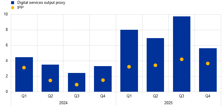 Notes: The proxy for digital services output covers the weighted non-seasonally adjusted production of publishing activities (statistical classification of economic activities (NACE) sector J58), computer programming, consultancy and related activities (NACE sector J62) and information service activities (NACE sector J63). IPP exclude Ireland. The latest observations are for the fourth quarter of 2025 for IPP and December 2025 for production data.