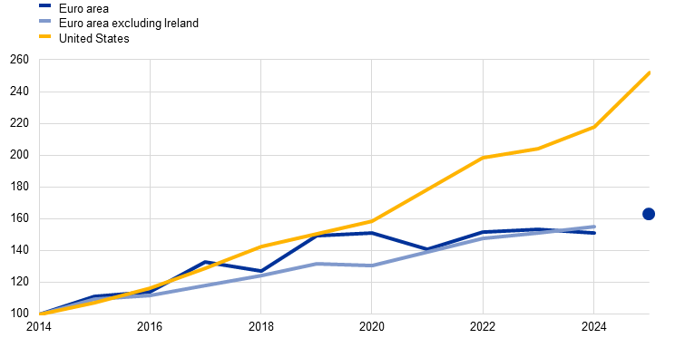 While digital investment in the euro area has expanded strongly, the pace of growth has been notably slower than in the United States. When extending the digital proxy with the estimated strong growth in digital services output in 2025 and netting out distortions in the overall trend owing to IPP volatility in Ireland, the results suggest that euro area digital investment may have expanded by just over 60% between 2014 and 2025 (Chart E). Despite this strong growth, a similar proxy for the United States more than doubled over the same period, accelerating notably in 2025 on the back of a strong pick-up in data centre investment.[5] This striking and ostensibly widening gap with the United States warrants further research to assess the extent to which it primarily reflects the generally smaller size of European firms, which makes the adoption of new technologies less profitable, structural rigidities in the euro area, or simply the United States’ “first mover” advantage in this field.[6]