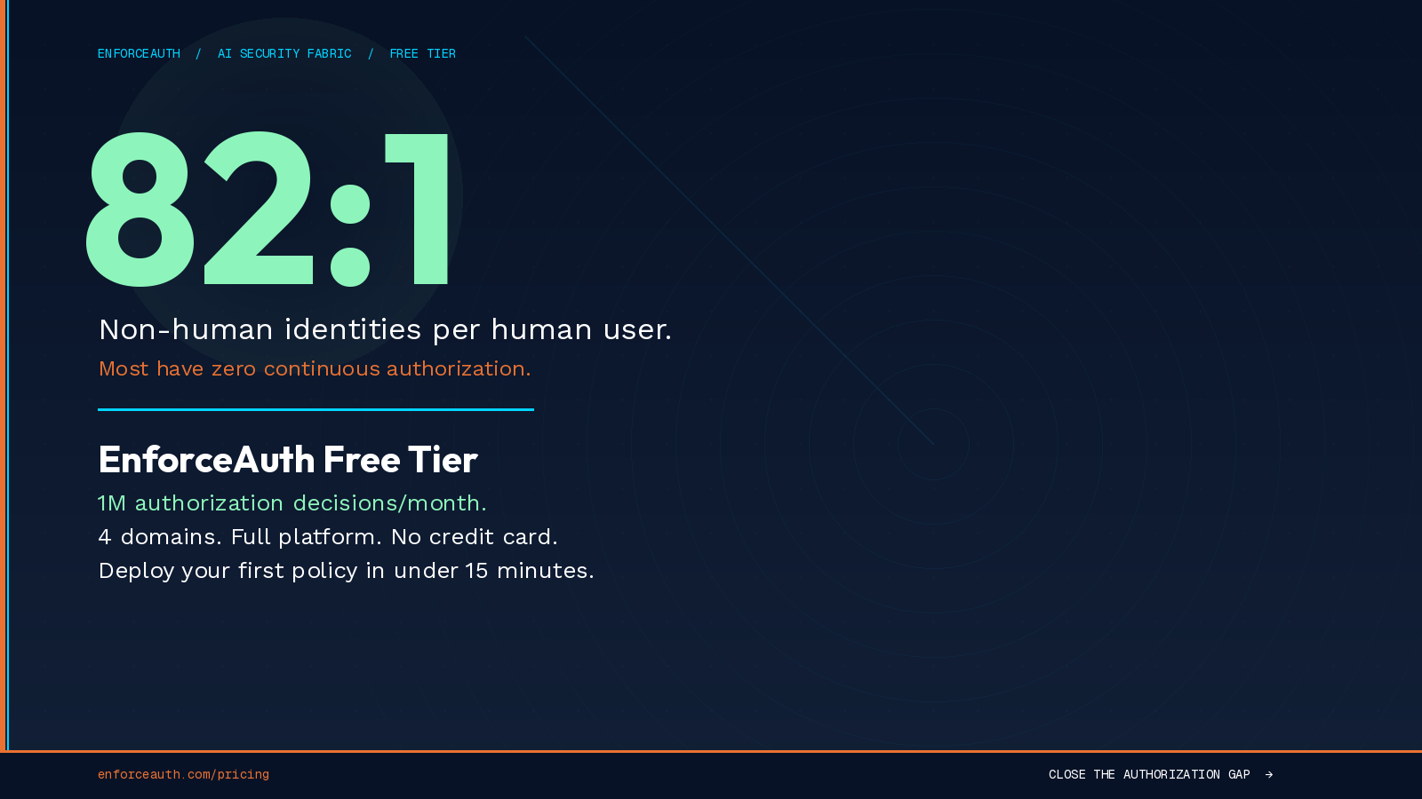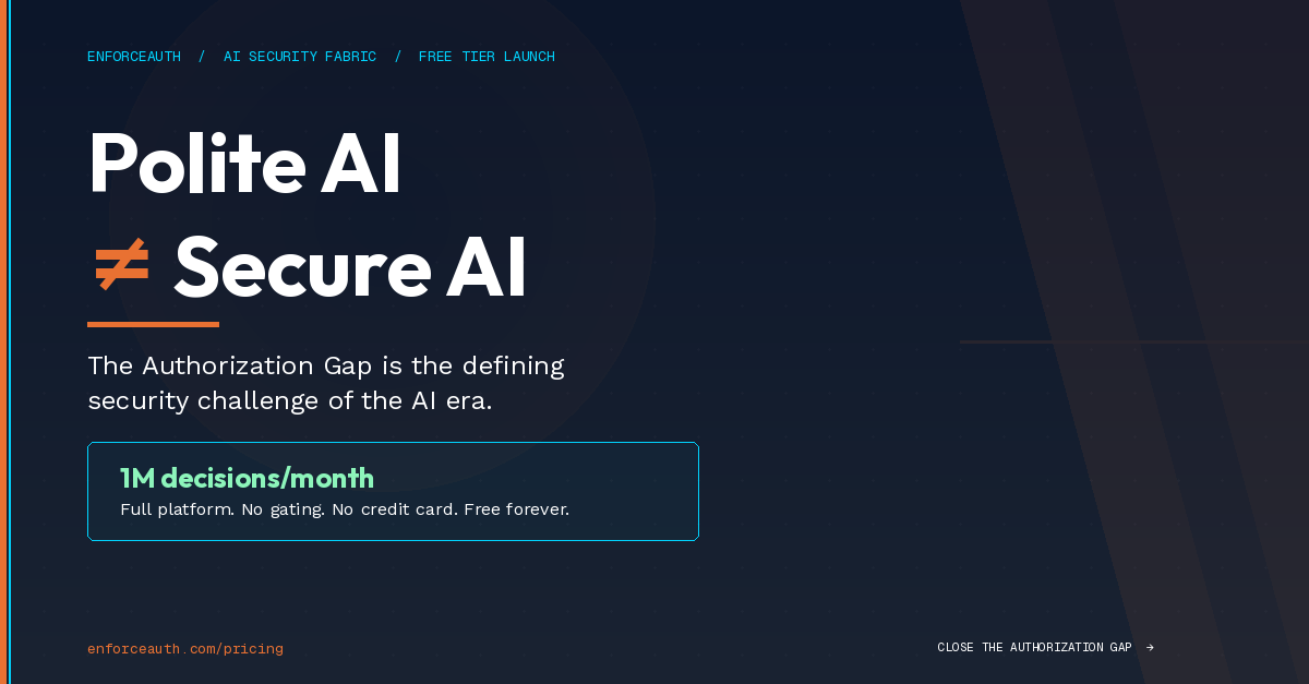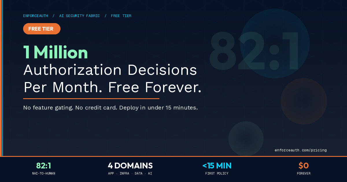 SAN DIEGO, CA, UNITED STATES, April 14, 2026 /EINPresswire.com/ -- Forty percent of enterprise applications will integrate AI agents this year, according to Gartner, yet nearly half of CISOs report those agents already exhibiting unauthorized behavior in production. EnforceAuth today launched a permanently free tier of its AI Security Fabric platform — delivering 1 million authorization decisions per month across applications, infrastructure, data, and AI workloads, with no feature gating and no credit card required.Non-human identities — AI agents, service accounts, and automated workflows — now outnumber human users by as much as 82 to 1 in enterprise environments, operating on sensitive data without continuous oversight. The industry’s prevailing response has been to authenticate once and then look away: legacy identity providers that trust indefinitely, point solutions that cover a single domain, or AI safety tools that filter language but enforce nothing at runtime. EnforceAuth calls this the Authorization Gap — and in a $35.4 billion AI cybersecurity market, nobody has closed it.