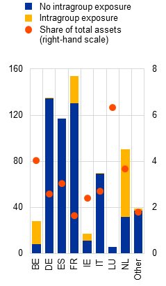 Intragroup linkages, in which banks fund entities within the same financial group, are very common. Exposures to other financial intermediaries (OFIs) and captive financial institutions are often contained within the same banking group. At least 55% of credit exposures to OFIs are classified as intragroup.[18] These exposures cannot be seen in consolidated banking data, but account for a large share of bilateral exposures visible in loan-level and security-level data. Such intragroup linkages are essential in financial conglomerates. Banks often provide a customer with multiple services which may be delivered by a dedicated NBFI entity. If the NBFI entity faces financial difficulties, the bank may opt to support it and absorb financial risks, even if it does not have a contractual obligation to do so, to mitigate legal and reputational risks.[19]
