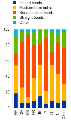 Euro area banks’ holdings of debt securities issued by NBFI entities are dominated by long-dated securitisation bonds with low credit risk, a sizeable share of which are in US dollars. Banks’ holdings of debt securities issued by NBFI entities stand at slightly above €650 billion, or about 2.5% of total assets in aggregate. They do, however, differ across bank business models and individual banks. Similar to bank lending to NBFI entities, intragroup holdings are sizeable (Chart B.5, panel a).[24] Asset managers and custodian banks are the largest holders of debt securities issued by NBFI entities, relative to total assets, albeit with pockets of high concentration which probably arise because they manage or hold investment portfolios.[25] Euro area banks’ holdings of NBFI entities’ debt securities are dominated by securitisation bonds, whether purchased on the open market or retained (Chart B.5, panel b).[26] Additionally, about 30% of bank holdings of such securities are denominated in US dollars. They consist mainly of long-dated agency mortgage-backed securities and offer a US dollar-denominated high-quality liquid asset reserve that provides a natural FX hedge against US dollar-denominated liabilities.[27] Credit risk associated with banks’ holdings of securities issued by NBFI entities seems contained. However, their long maturity exposes banks to interest rate and liquidity risk (Chart B.5, panel c).
