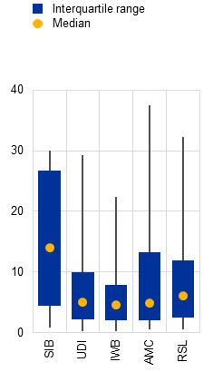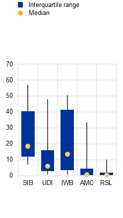 Notes: SIB stands for systemically important banks; UDI stands for universal and diversified institutions, which include universal banks and diversified lenders; IWB stands for investment and wholesale banks; AMC stands for asset managers and custodian banks; RSL stands for retail banks and small lenders; CRE stands for commercial real estate; REIT stands for real estate investment trust. Panel c: boxes show the interquartile range, dots denote medians, whiskers span the 5th to the 95th percentiles.