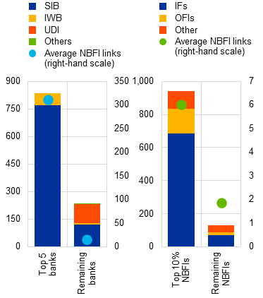 Interconnections between banks and NBFI entities reflect the wide range of financial services the two sectors provide to each other. NBFI entities are a diverse group of intermediaries that perform a range of economic functions.[2] However, most of them rely on banks to manage liquidity, obtain leverage and access financial markets (in which banks act as market-makers). Some NBFI entities invest in banks’ capital and long-term debt funding and provide insurance and guarantees.[3] These activities expose both sectors to credit, market, liquidity and operational risks, resulting in a complex landscape of connections which may give rise to systemic risk. Recent episodes of financial stress have demonstrated how the concentration of these connections among single firms[4] or groups of similar firms[5] could raise financial stability concerns.