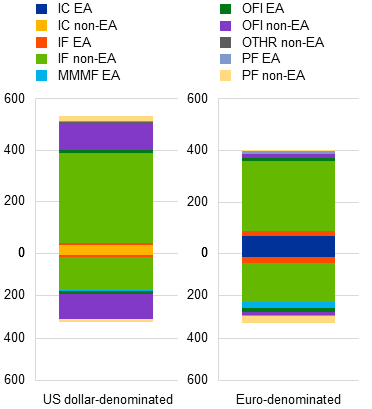 Banks’ short-term liabilities from NBFI entities are concentrated and highly segmented at the level of individual banks. In particular, a small number of euro area banks hold a large share of total non-bank repo and deposit liabilities from NBFI entities. This is particularly evident in the repo market, where the top five banks – all G-SIBs – account for approximately 65% of euro area banks’ repo borrowing from NBFI entities (Chart B.2, panel a) while accounting for 35% of the total assets of euro area significant institutions. Short-term liabilities to NBFI entities are provided mainly by investment funds and other financial institutions (such as broker-dealers), while money market mutual funds lend US dollars on a secured basis and provide unsecured commercial paper funding. This segmentation reflects differences in the sizes of the NBFI sectors and their respective investment mandates. It also highlights the concern that funding outflows may be difficult to replace in the short term. This is because providers of specific types of liabilities tend to follow similar business models, which may result in concentrated withdrawals.[12]