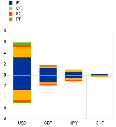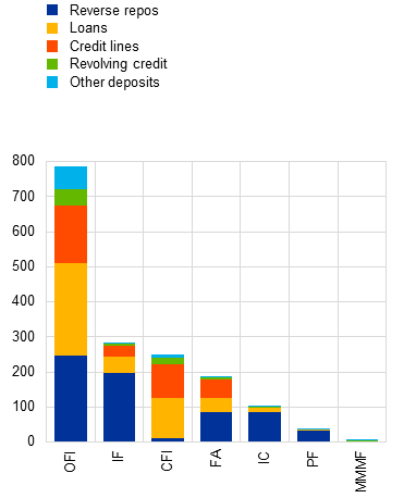 Notes: OFI stands for other financial intermediaries; IF stands for investment funds; CFI stands for captive financial institutions; FA stands for financial auxiliaries; IC stands for insurance corporations; PF stands for pension funds; MMMF stands for money market mutual funds. Panel a: positive values indicate reverse repo lending, negative values repo borrowing. EA stands for euro area; OTHR comprises all other non-identifiable NBFI entities. Panel b: OFI comprises other financial intermediaries, captive financial institutions, and financial auxiliaries. Net notional derivatives positions are calculated at bank-level offsetting positions across NBFI counterparties within the same NBFI sector, maturities and derivatives contract types. Positive (negative) values indicate banks which are net receivers (payers) in the corresponding foreign currency.