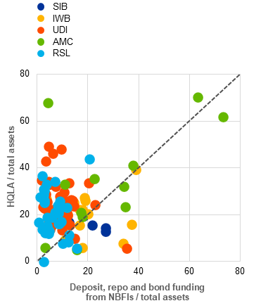 Banks with highly specialised business models rely heavily on volatile liabilities to NBFI entities but maintain low liquidity buffers