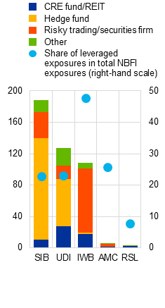 Lending to NBFI entities creates pockets of vulnerability, as many NBFI counterparties follow business models that are predicated on the use of leverage. A classification of NBFI entities by sector, business model and geographical location can shed light on the scale of bank interconnections with NBFI entities that are using leveraged strategies. NBFI entities that deal in residential or commercial real estate (such as real estate investment trusts, REITs), as well as private credit or private equity funds, hedge funds, international securities or commodities trading firms and loan originators (such as leasing companies), rely on leverage to achieve their investment objectives. However, the scale of such leverage and the resulting maturity and liquidity mismatches differ across firms and business models.[20] This financial leverage is, to some extent, provided by euro area banks. The latest available data suggest that around €432 billion, or 26%, of the €1.66 trillion that can be identified of euro area banks’ total exposures to NBFI entities, involve such leveraged firms.[21] Other NBFI entities, including insurance corporations, pension funds, money market and investment funds, financial auxiliaries and captive financial institutions, are assumed to use no or limited leverage, given that they are often tightly restricted by regulation.[22]