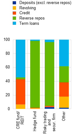 Hedge funds and risky trading and securities firms, which are typically more opaque, highly leveraged and prone to liquidity mismatches, account for the largest share of borrowing by leveraged NBFI entities from banks. Linkages with hedge funds and risky trading and securities firms are almost exclusively via the repo market, where banks provide very short-term collateralised loans. Other leveraged NBFI entities tend to use a more diverse mix of bank lending instruments, including revolving facilities and credit lines (Chart B.4, panel b).